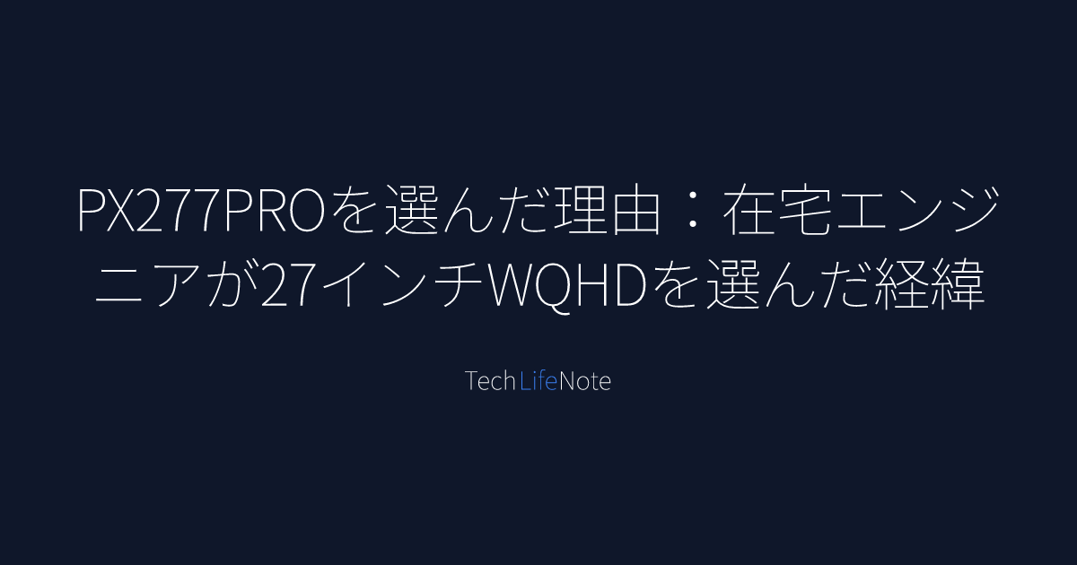 MacBookとPS5で使いたかった私が、PX277PROを選んだ理由と、実際に使って分かったポイントをまとめました。 27インチWQHDモニターを在宅エンジニアの視点から検討した経緯を整理します。