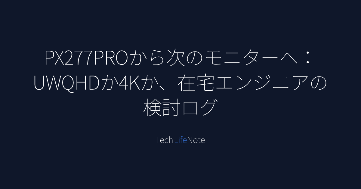 PX277PRO(27インチWQHD/165Hz/USB-C)を基準に、UWQHD 34インチと4K 27インチをどう比較しているか。 MacBookとPS5との相性も含めた検討途中メモです。